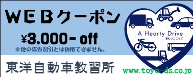 東洋自動車教習所では、入校時にこのクーポンをプリントアウトしてお持ち頂くと3,000円の割引を致します。